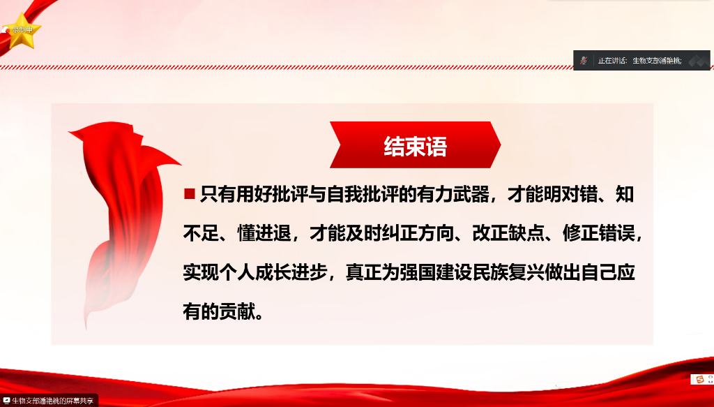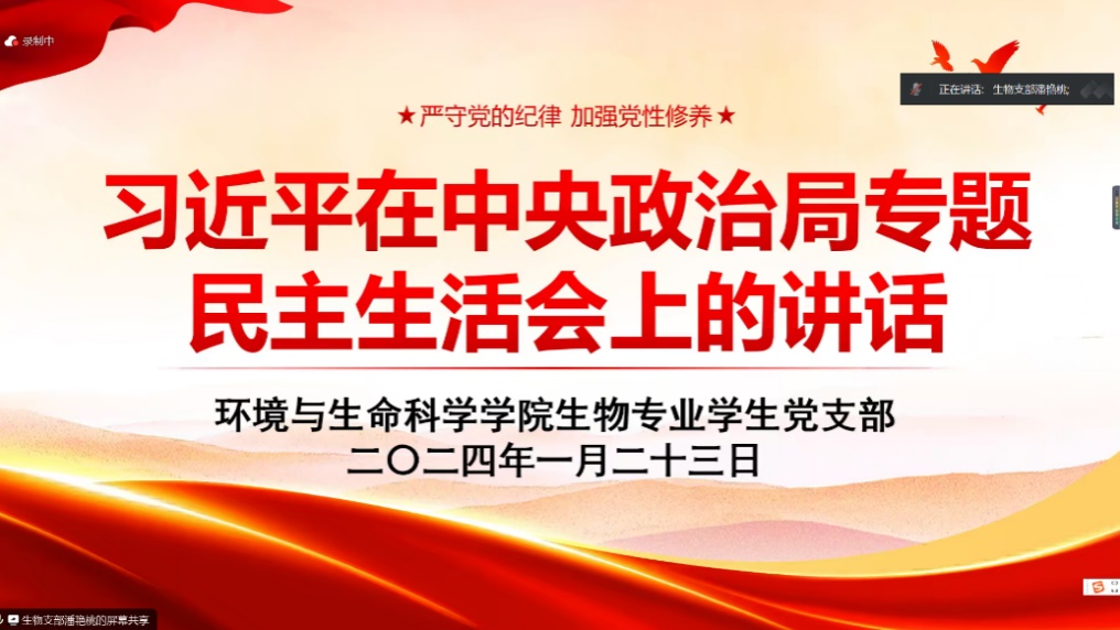 为深入学习宣传贯彻习近平在中央政治局专题民主生活会上的讲话内容,必赢3003no1线路检测中心生物专业学生党支部于1月23日19:30以线上会议的形式开展了“习近平在中央政治局专题民主生活会上的讲话”主题党课培训。本次会议参会人员为生物专业学生党支部全体党员,此次培训课程由党支部副书记潘艳桃主持。