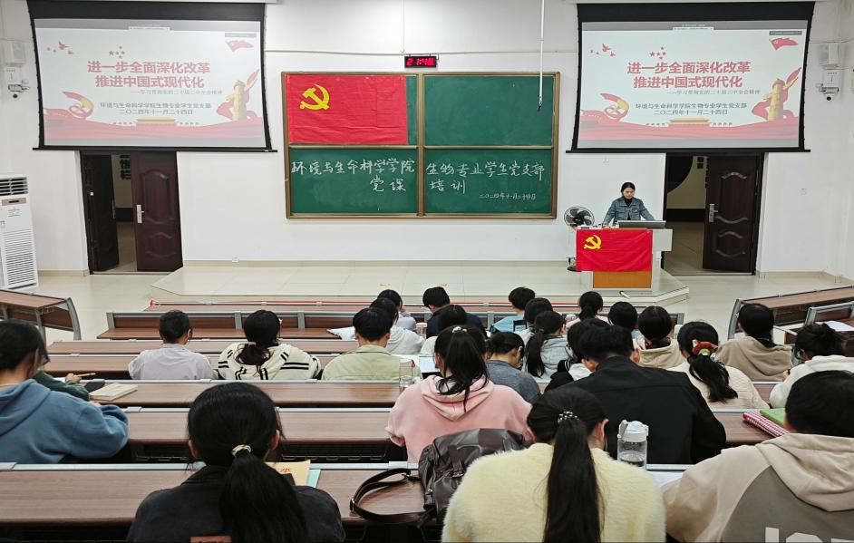 为深入学习贯彻党的二十届三中全会精神,全面理解中国式现代化的深刻内涵与重大意义,必赢3003no1线路检测中心生物专业学生党支部于11月24日在武鸣校区地海楼B109教室开展了“全面深化改革,推进中国式现代化”主题党课学习活动。生物专业学生党支部全体党员参与学习,支部副书记梁彩叶主持此次党课。