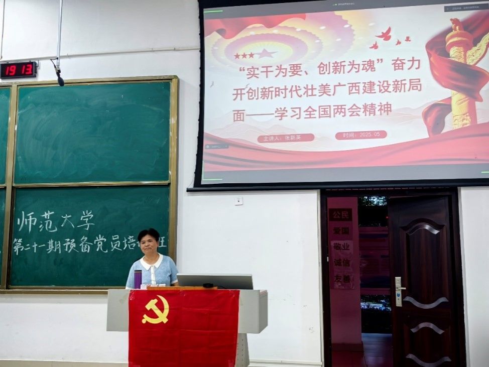 随后,张新英副院长以“‘实干为要、创新为魂’奋力开创新时代壮美广西建设新局面——学习全国两会精神”为主题,为学员们带来了一场内涵丰富的党课培训。她紧密围绕全国两会以及“广西新春第一会”核心内容,深入浅出地阐述了文化融合与民族地区产业发展、乡村振兴与生态振兴、民族地区发展与国家战略等重要议题。她强调,作为新时代的党员青年,要善于抓住发展机遇,在面对挑战时勇往直前,以实干为导向,明确自身责任,将个人理想与国家战略紧密结合,积极贡献青春力量。