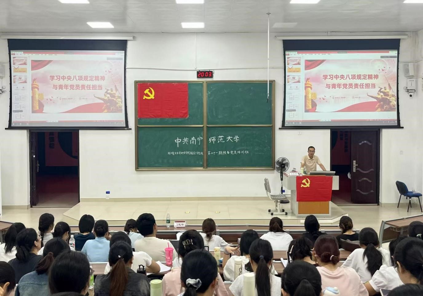 会上,韦东林围绕中央八项规定精神核心要义、青年党员落实八项规定实践要求、新时代青年党员素质提升路径三方面展开讲解,强调青年党员要从八项规定中汲取经验,在基层实践中锤炼作风、弘扬勤俭美德、严守纪律底线,并通过理论学习、警示教育及跨学科实践等提升政治定力与实干本领,发挥先锋模范作用。同时,他希望参训的学员们能传承党的优良作风,投身基层实践,反对形式主义,践行勤俭节约,参与党内监督,筑牢底线思维,带动群众践行八项规定精神,彰显责任担当。