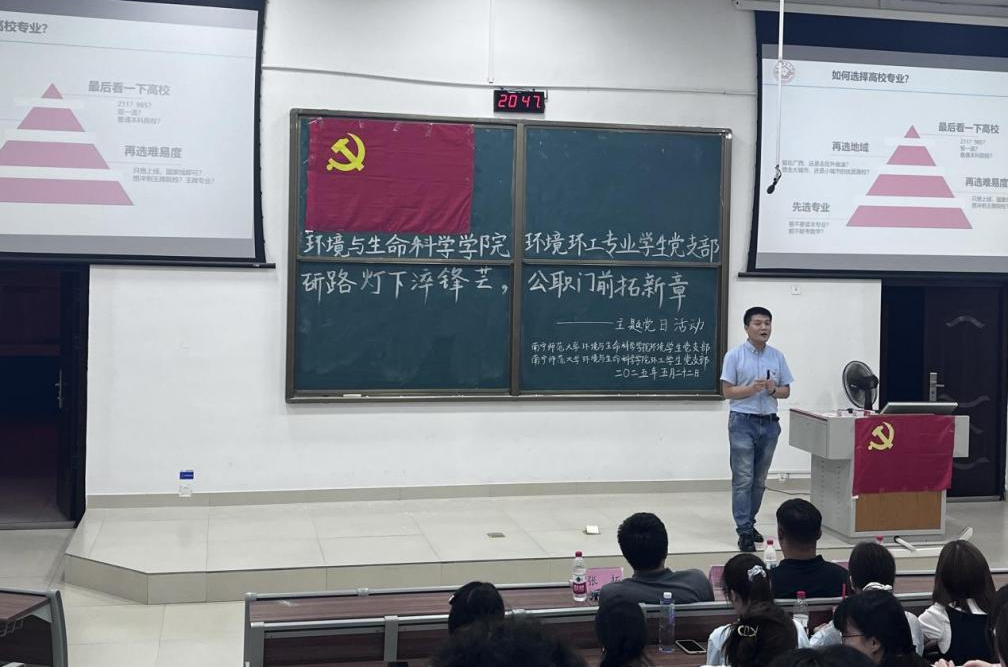 为增强同学们对考研、考公的了解,进一步调动同学们的考研、考公的积极性,帮助同学们更好地备考及就业,必赢3003no1线路检测中心环境与环工专业学生党支部于5月22日晚在地海楼B109教室开展“研路灯下淬锋芒,公考路上谱新章”主题党日活动。与会人员有学院党委专职组织员兼环工专业学生党支部书记普胤杰、环境专业学生党支部书记张拓、党员教师曲炳鹏及环境科学专业与环境工程专业2021级、2022级及2023级部分学生。