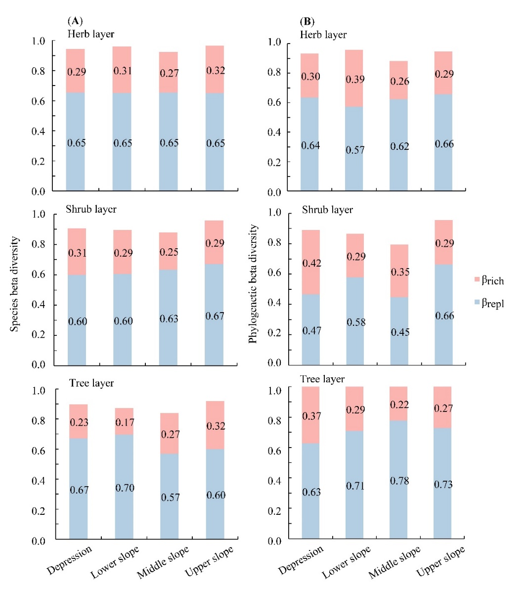 图 3. 喀斯特峰丛洼地中不同坡位植物物种和系统发育β 多样性及其组分