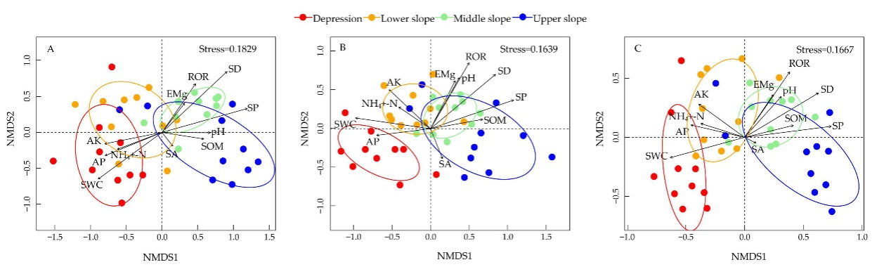 图 2. 喀斯特峰丛洼地中不同坡位样地和环境因素的非度量多维标度 (NMDS) 排序分析