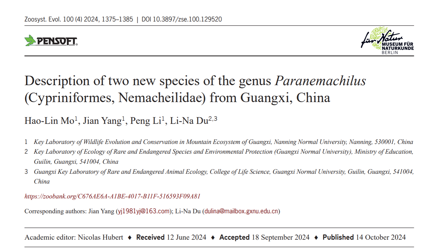 10月14日,必赢3003no1线路检测中心2021级生物科学专业本科生莫昊霖同学以第一作者的身份在国际动物分类学期刊《Zoosystematics and Evolution》(SCI收录,影响因子1.6,JCRQ2,中科院二区)上发表了题目为《Description of two new species of the genusParanemachilus(Cypriniformes: Nemacheilidae) from Guangxi, China》的研究论文(doi: 10.3897/zse.100.129520.)。该论文是在该院杨剑研究员和广西师范大学生命科学学院杜丽娜副教授共同指导下完成的。这是继该院本科生钟佳宏同学以第一作者身份于2024年9月发表SCI论文以来的第2篇以本科生作为第一作者在同一SCI期刊发表的学术论文。