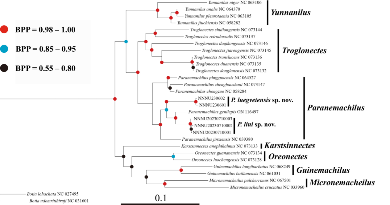 莫昊霖同学出于对洞穴生物的兴趣,自2015年开始探索广西各地的洞穴生物,积累了较多的洞穴鱼类分布区域、数量等资料。通过对2017年采自广西柳州的一种洞穴鱼标本,以及于2023年6月采自广西武鸣的另一种洞穴鱼标本鉴定,他发现它们均属于异条鳅属鱼类物种。通过与本属其他物种的形态和线粒体细胞色素b基因序列的对比,证实这两种洞穴鱼类为异条鳅属中的两个新物种,将其分别命名为柳氏异条鳅Paranemachilus liui和骆越异条鳅Paranemachilus luegvetensis。
