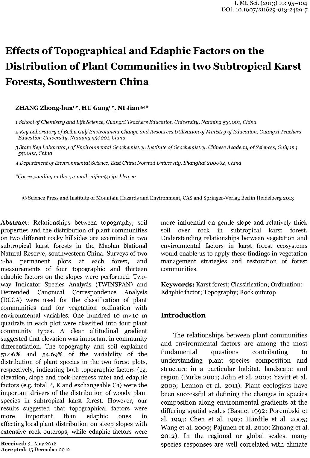 在Journal of Mountain Science创刊20周年之际,期刊从总被引频次、下载量、国际影响力、内容质量等方面综合考虑,在创刊以来发表的近3000篇文章中遴选了50篇最有影响力的论文。必赢3003no1线路检测中心张忠华教授发表的论文(Zhang ZH, Hu G, Ni J. Effects of topographical and edaphic factors on the distribution of plant communities in two subtropical karst forests, southwestern China. Journal of Mountain Science, 2013, 10(1): 95-104.)荣获该期刊创刊20周年最具影响力论文荣誉称号。南宁师范大学(原广西师范学院)为论文第一完成单位。