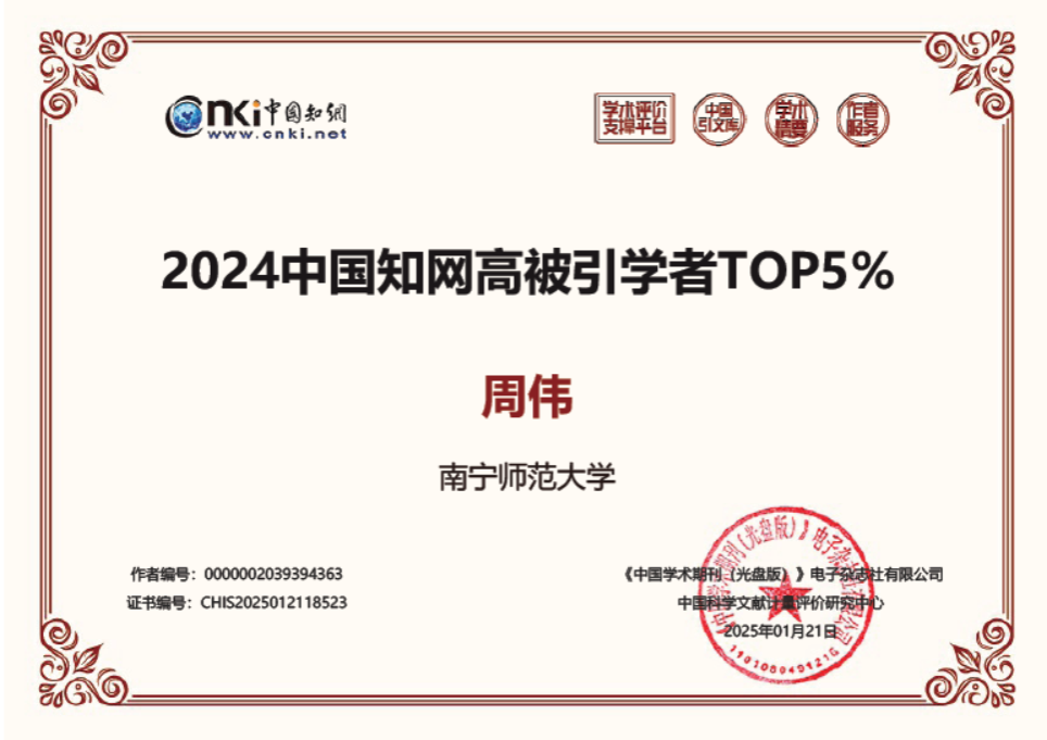 近日,中国知网下属的中国科学文献计量评价研究中心基于中国知网收录的国内学术成果,首次开展学者学术影响力客观评价,遴选了“2024中国知网高被引学者”预发布名单。必赢3003no1线路检测中心必赢3003no1线路检测中心周伟老师入选“2024中国知网高被引学者Top5%”榜单。