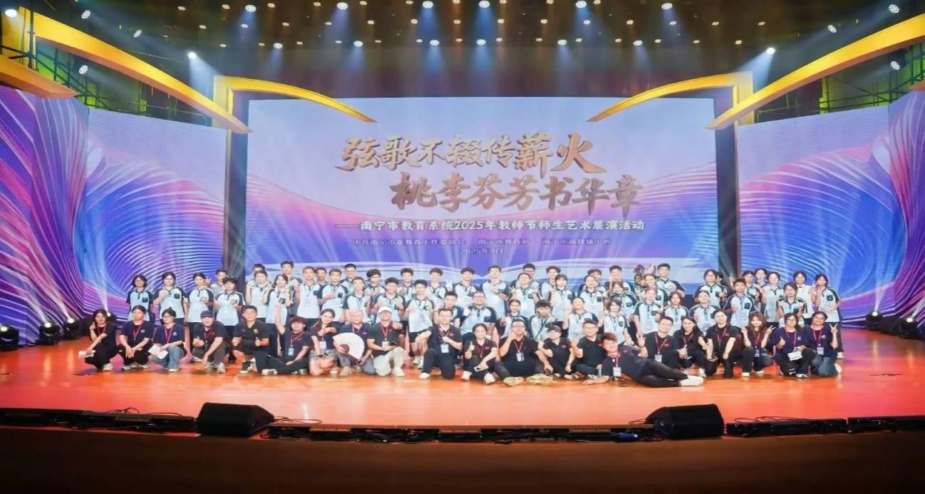 当晚,高中部师生代表齐聚学校知新楼报告厅,参加南宁市教育系统2025年教师节师生艺术展演活动。志愿者们分工协作,有序引导观众入场,并在后台协助完成道具调度等保障工作。舞台上,学生演员以优美的舞蹈深情诠释师生间的深厚情谊,赢得阵阵掌声。实习生与全校师生一同观看演出,共同展现南宁十四中积极向上、团结奋进的昂扬风貌。本次活动既是对教师节的深情献礼,也充分体现了学校积极融入全市教育发展大局的决心与担当。
