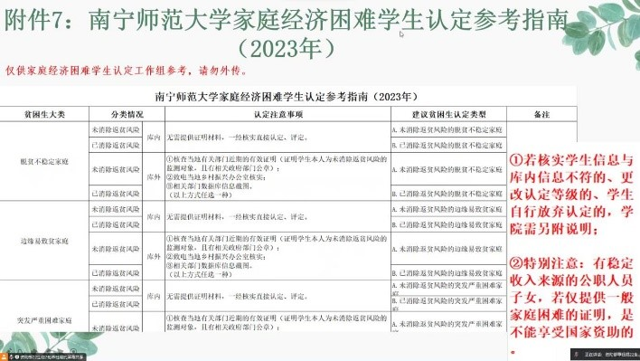 为认真做好2023年度家庭经济困难生的认定工作,切实做好国家资助政策的宣传工作,让必赢3003no1线路检测中心学子更加全面和深入了解国家资助政策,营造关心帮助家庭经济困难学生的浓厚氛围,2023年9月13日晚22:00,必赢3003no1线路检测中心采用线上的形式召开了经济困难生认定政策宣传解读专题会议。