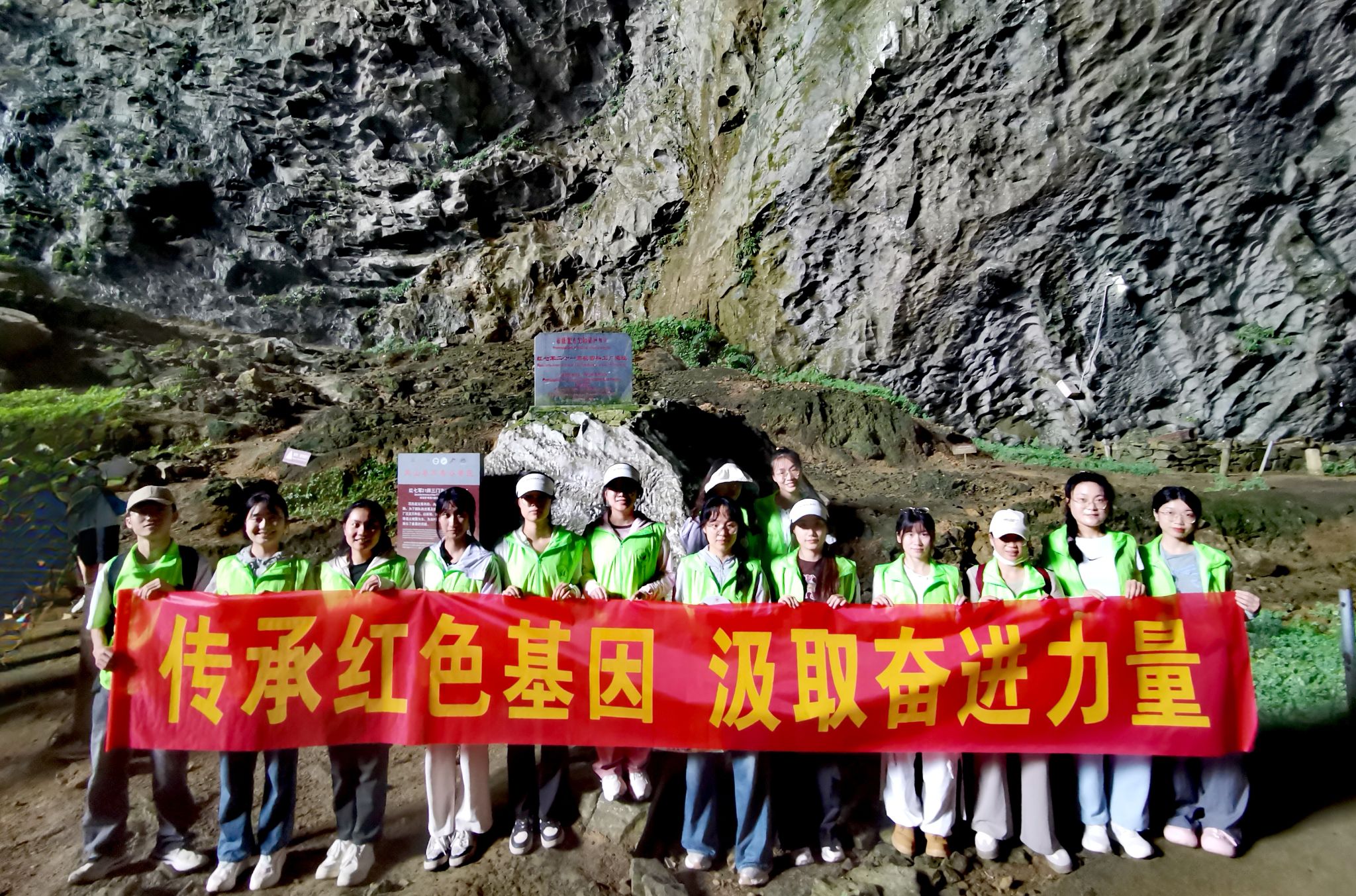 万寿谷景区内有规模庞大、结构复杂的地下河,天坑、洞穴、天窗等共生或伴生,以石成林,形态各异。实践团成员们走在这神奇谷洞,无人不惊叹大自然的造化与神奇。在讲解员的带领下,成员们来到曾是中国工农革命三大领袖韦拔群所领导的红七军二十一师的秘密兵工厂遗址。参观中,成员们纷纷表示深切感受到工农红军坚定的革命意志。
