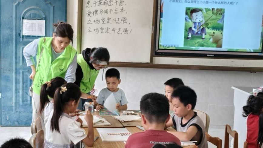 在基础课程教学中,志愿者采用趣味问答、小组竞赛等形式,让学生在轻松氛围中掌握知识,提升学习兴趣。主题班会与故事分享会则传递诚信、友善等价值观,引导学生树立正确观念,点燃孩子们的爱国情。“硬笔书法”教学从横竖撇捺起步,志愿者逐一对孩子们的握笔、运笔姿势纠正,让汉字之美在稚嫩笔尖流淌。