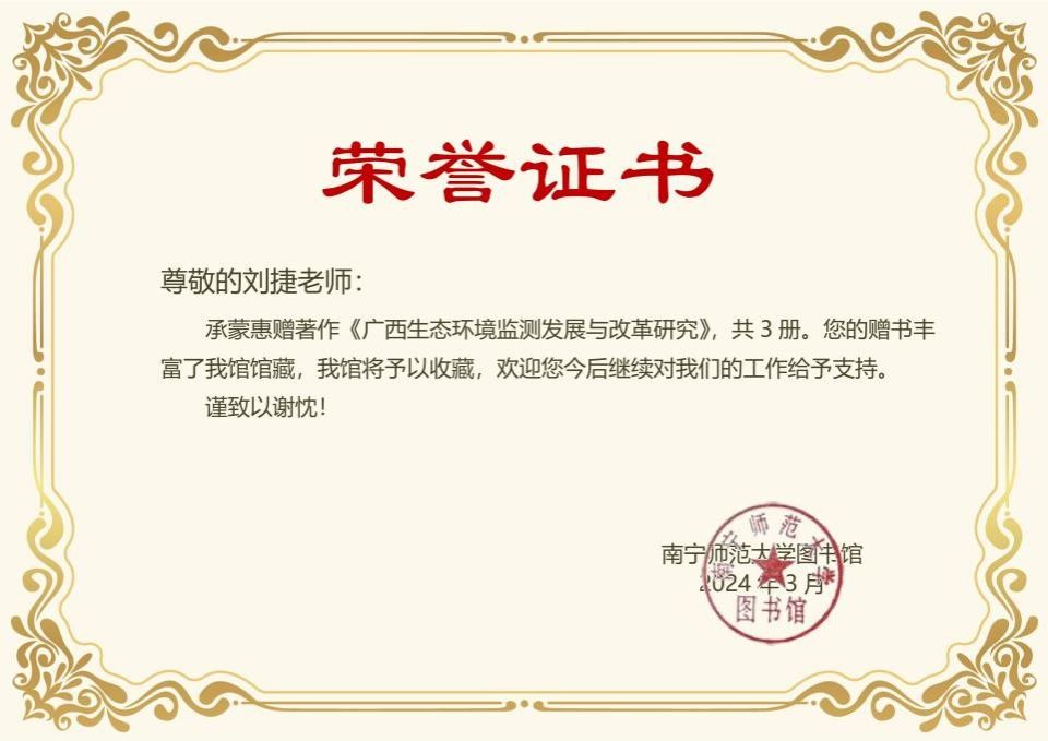 (南宁师范大学图书馆给刘捷颁发捐赠荣誉证书)