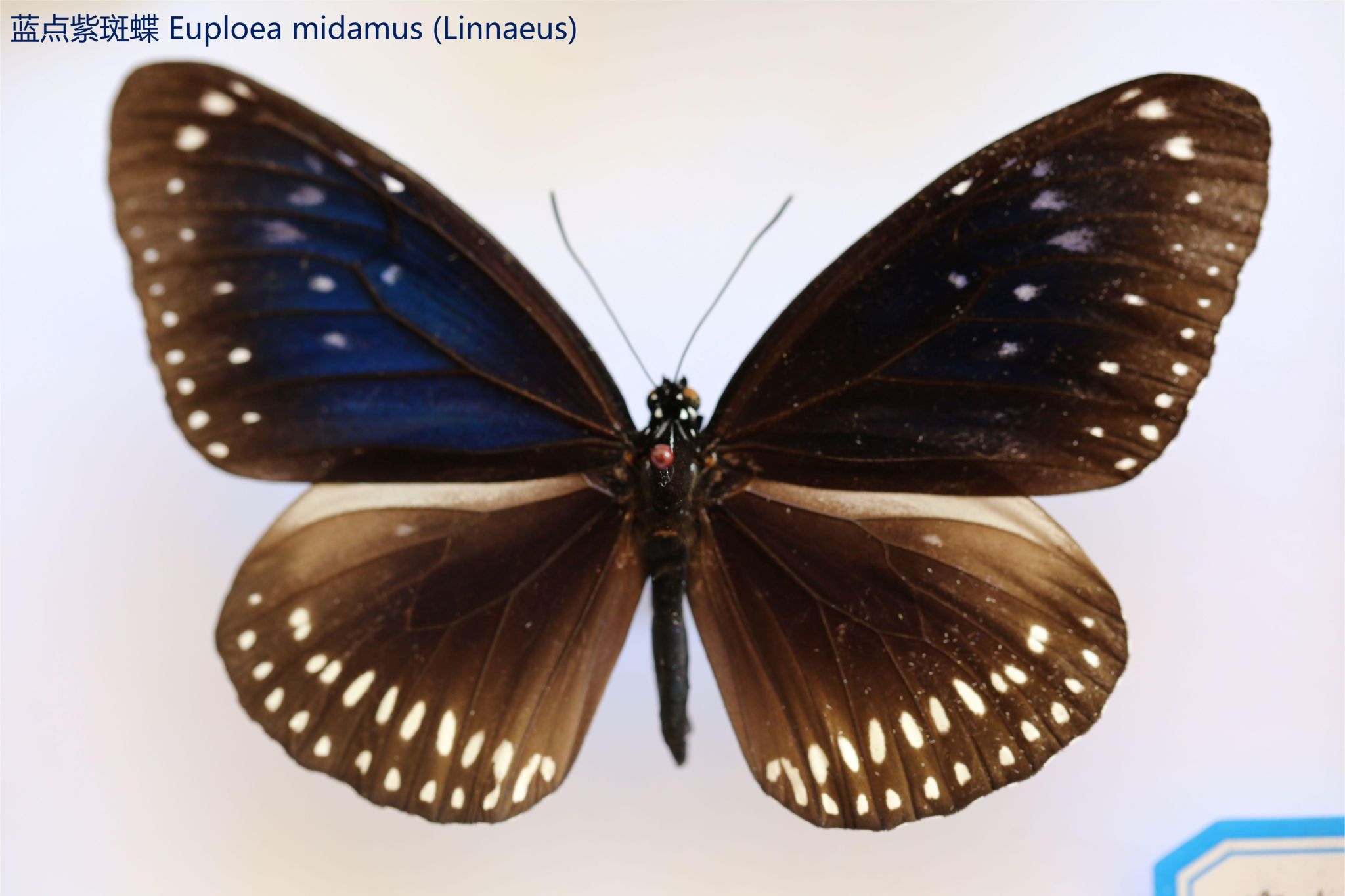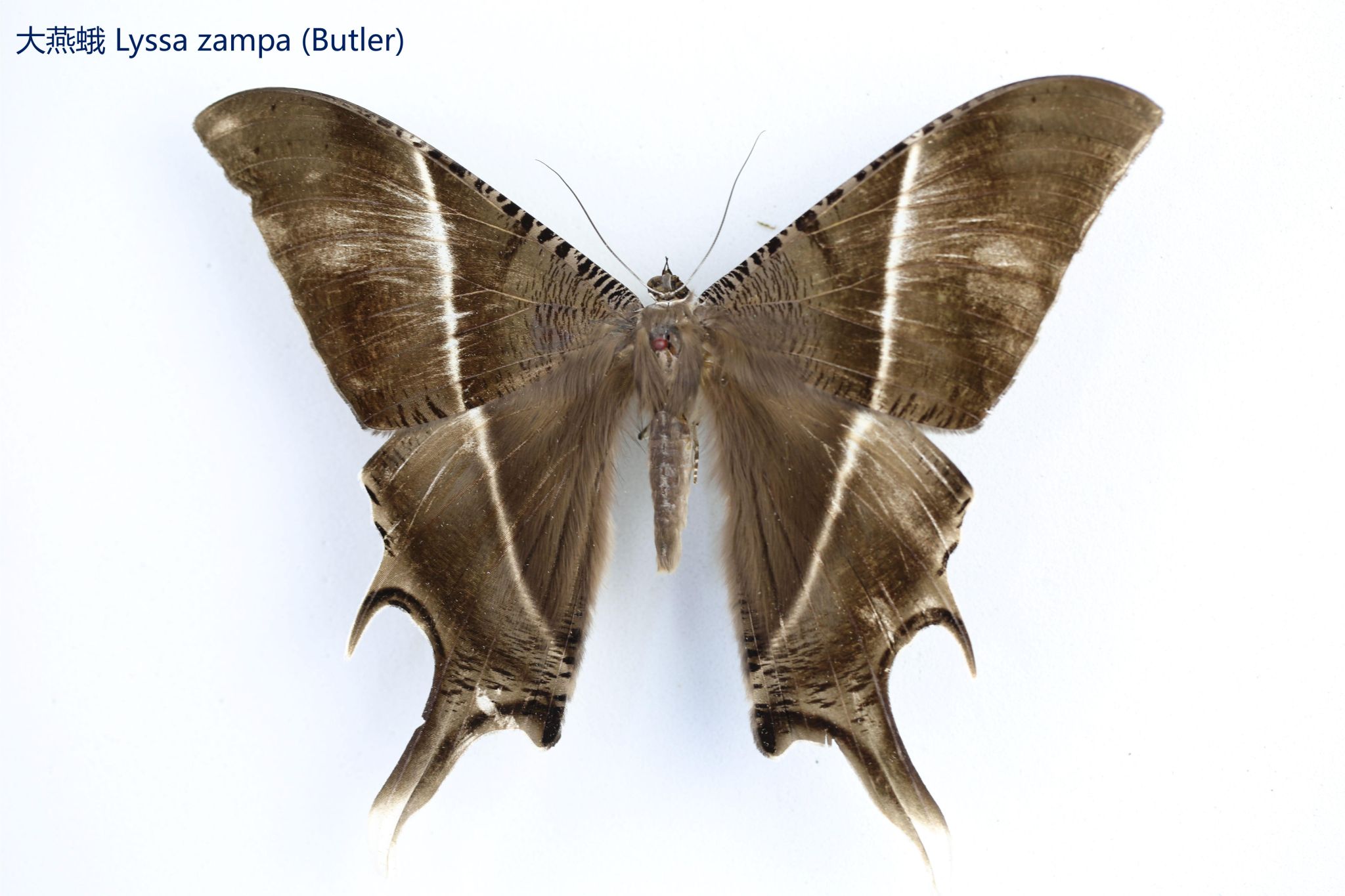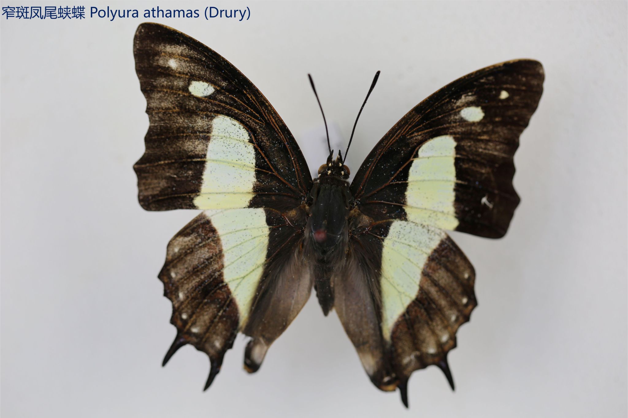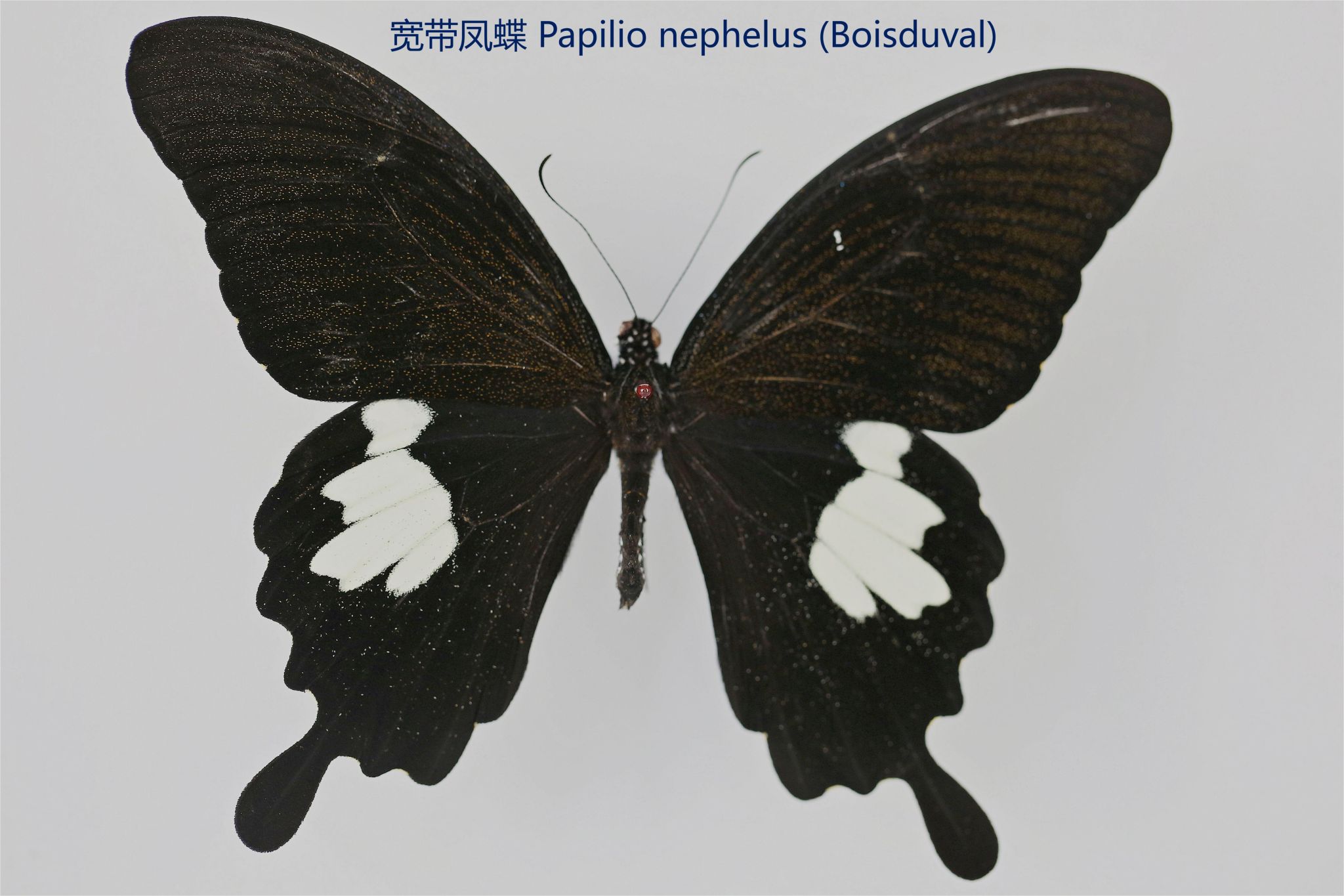 鳞翅目凤蝶科。翅表散布金绿色鳞片,后翅正面有大块的金属蓝色斑块,蓝斑与后翅内缘间有金绿色细丝纹相连。后翅反面外缘具有新月形红斑,还有一个明显的叶状尾突,看起来像一条小尾巴。