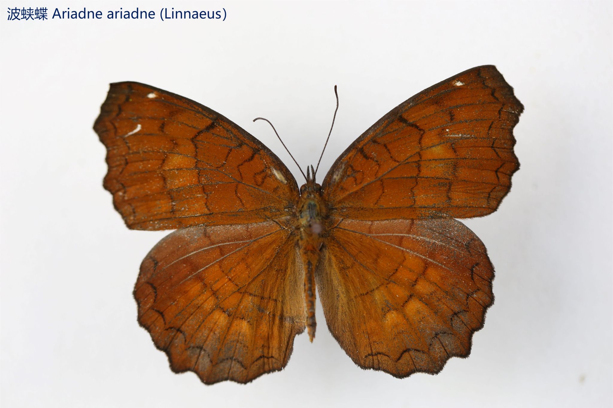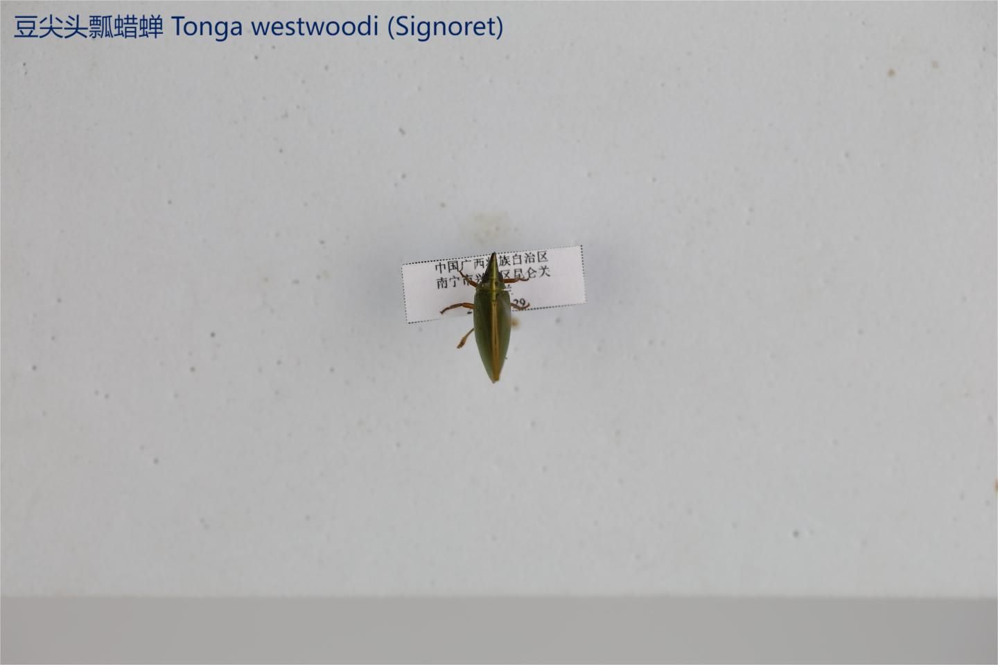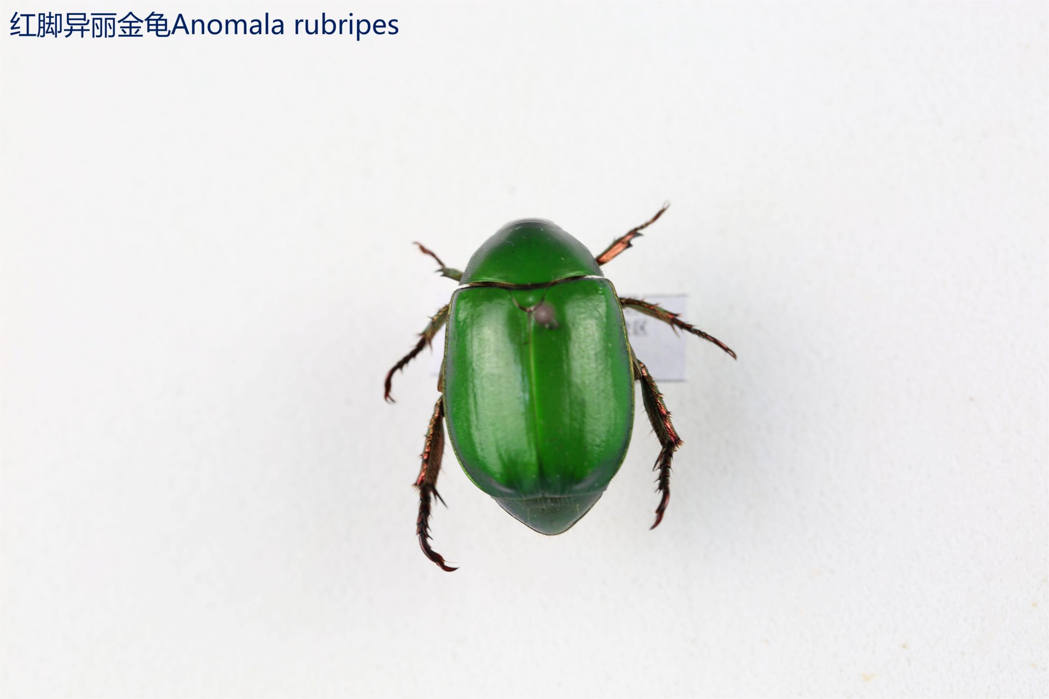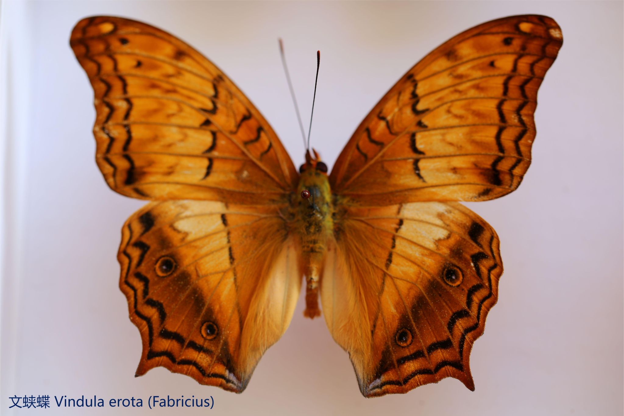 鳞翅目凤蝶科。翅表散布金绿色鳞片,后翅正面有大块的金属蓝色斑块,蓝斑与后翅内缘间有金绿色细丝纹相连。后翅反面外缘具有新月形红斑,还有一个明显的叶状尾突,看起来像一条小尾巴。
