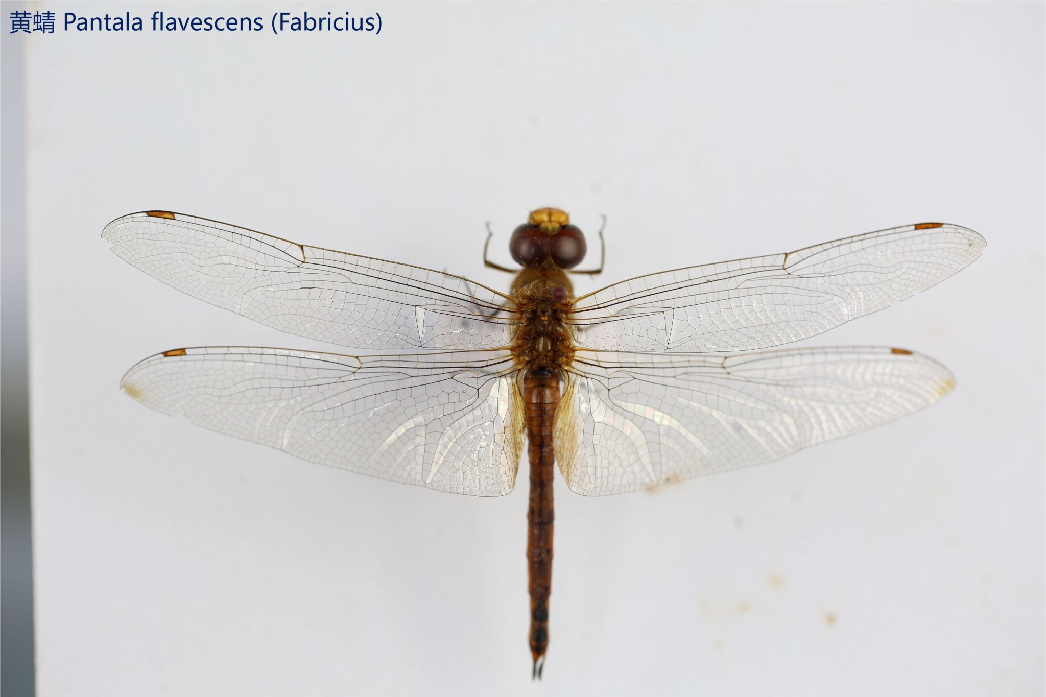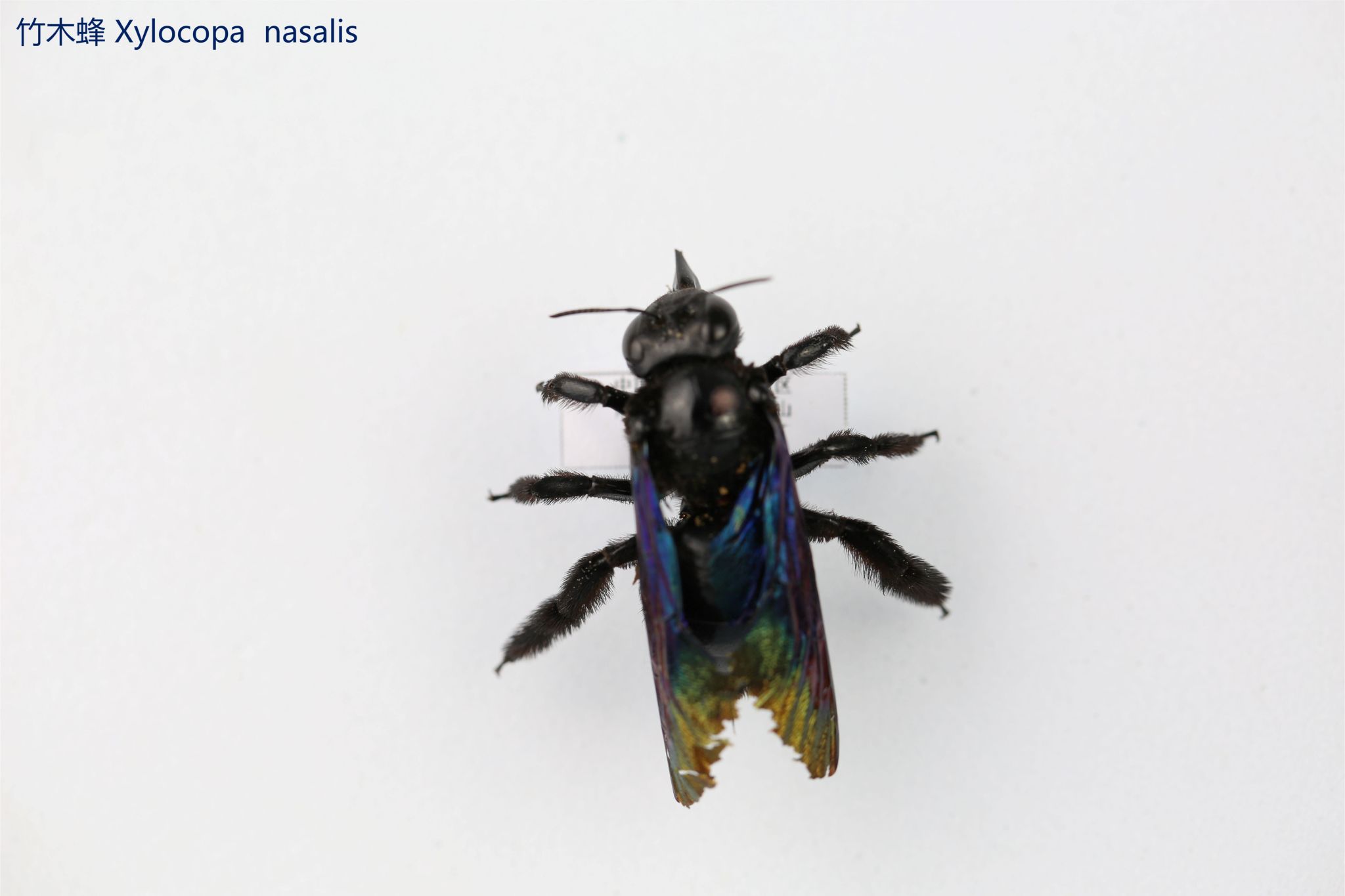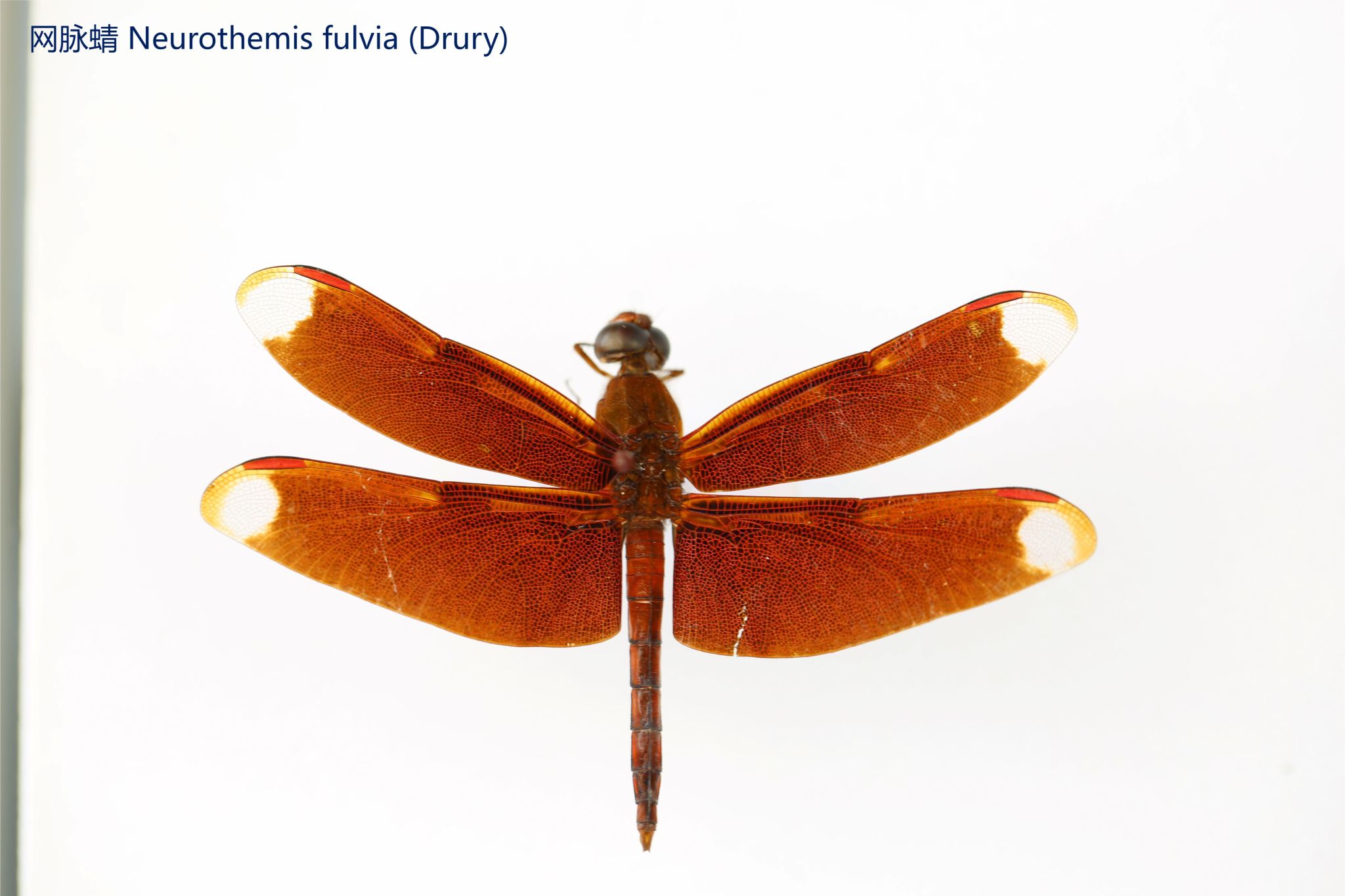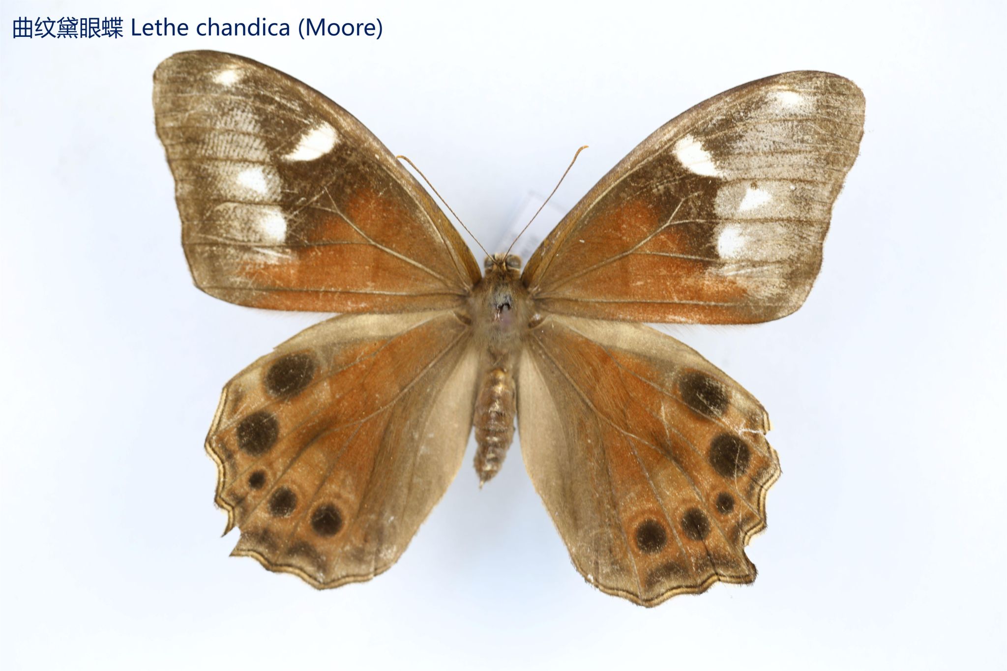 鳞翅目凤蝶科。翅表散布金绿色鳞片,后翅正面有大块的金属蓝色斑块,蓝斑与后翅内缘间有金绿色细丝纹相连。后翅反面外缘具有新月形红斑,还有一个明显的叶状尾突,看起来像一条小尾巴。