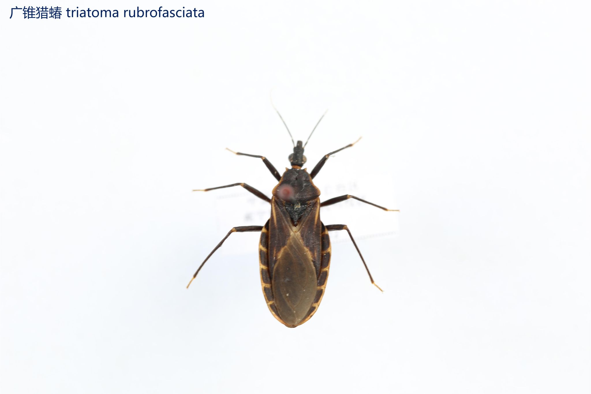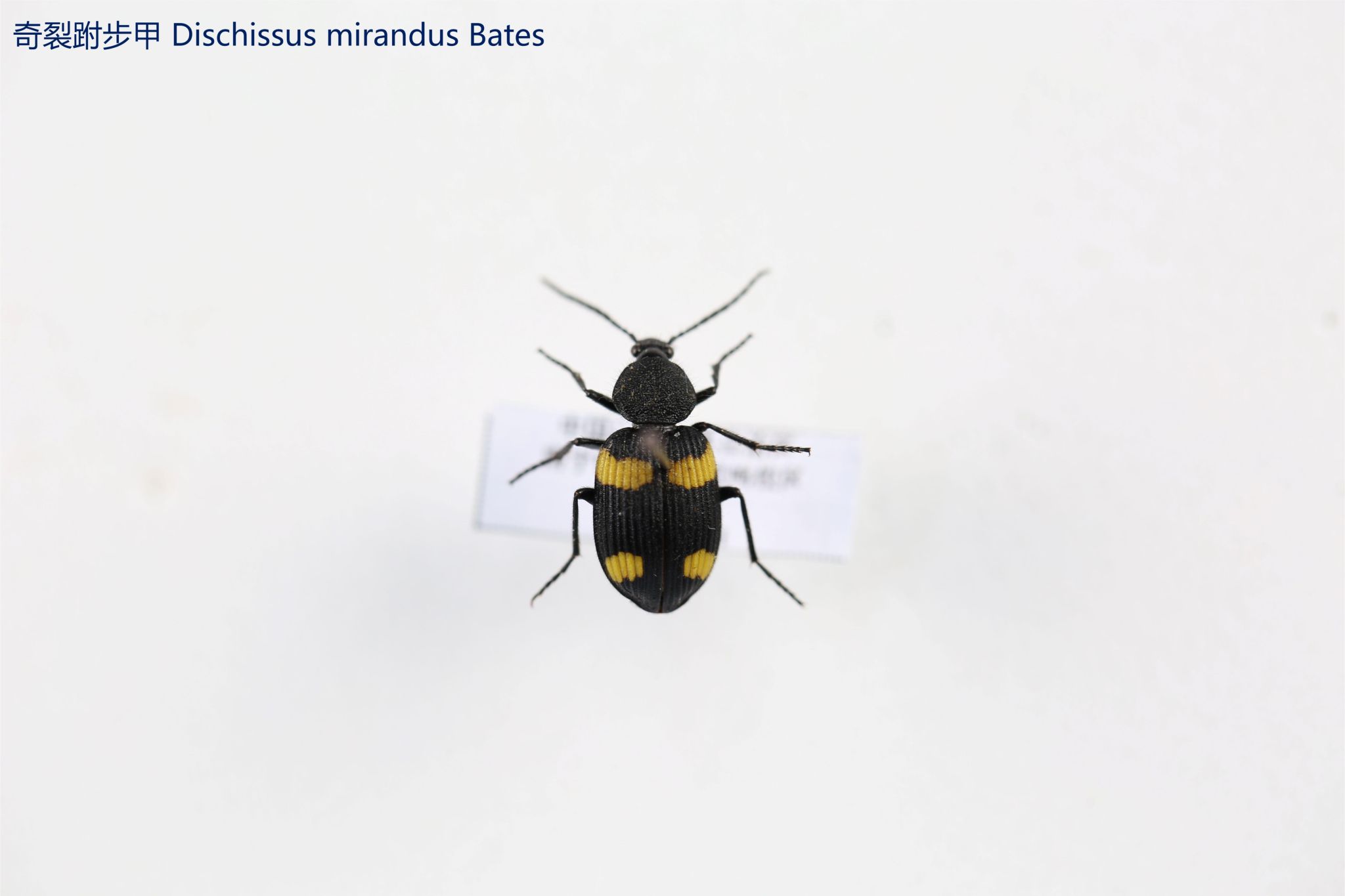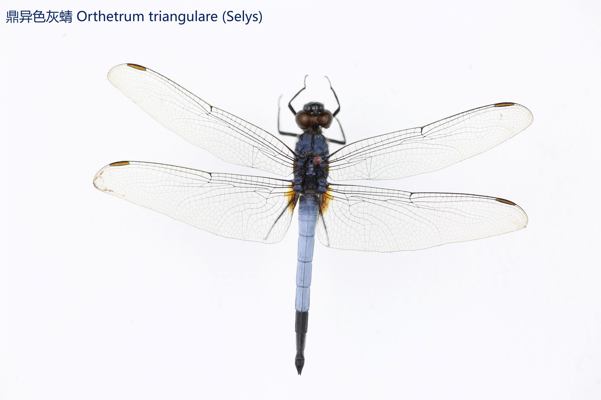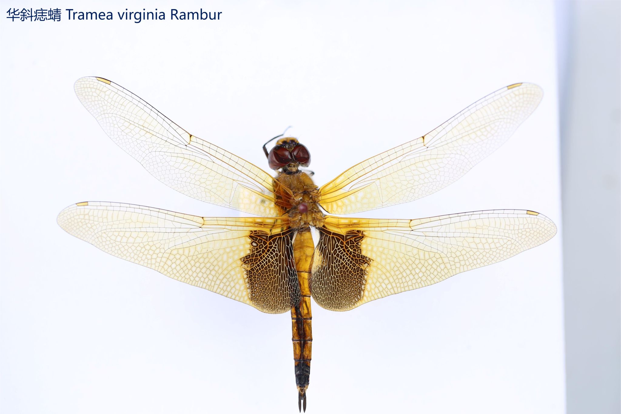 鳞翅目凤蝶科。翅表散布金绿色鳞片,后翅正面有大块的金属蓝色斑块,蓝斑与后翅内缘间有金绿色细丝纹相连。后翅反面外缘具有新月形红斑,还有一个明显的叶状尾突,看起来像一条小尾巴。